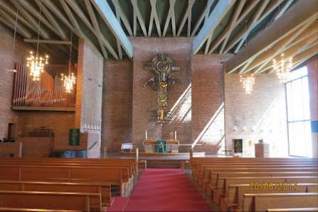 Fin mursteinkirke fra 1966. Romslig kirkerom, og menighetssal i underetasjen der det er formiddagstreff annenhver uke.